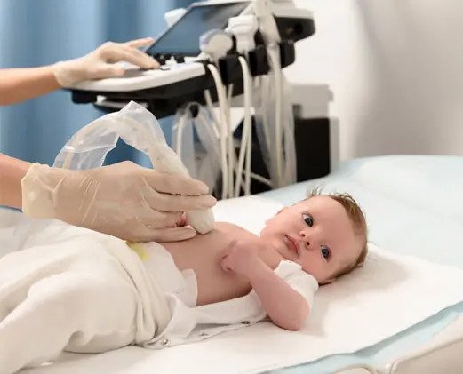 El niño se acostará en una camilla, o incluso en el regazo de uno de los padres para que esté más tranquilo. aplicamos el gel y pasamos el transductor por el área del corazón.